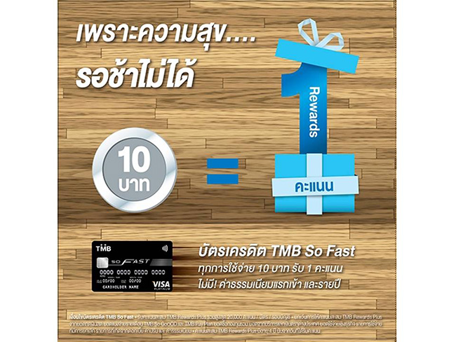 บัตรเครดิต TMB SO Fast ทุกการใช้จ่าย 10 บาท รับ 1 คะแนน ไม่มี! ค่าธรรมเนียม แรกเข้าและรายปี