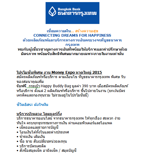 CONNECTING DREAMS FOR HAPPINESSด้วยผลิตภัณฑ์และบริการทางการเงินครบวงจรที่บูธธนาคารกรุงเทพพบกับผู้เชี่ยวชาญทางการเงินที่พร้อมให้บริการและคำปรึกษาด้วยมิตรภาพ พร้อมรับสิทธิพิเศษมากมายเฉพาะภายในงานเท่านั้น