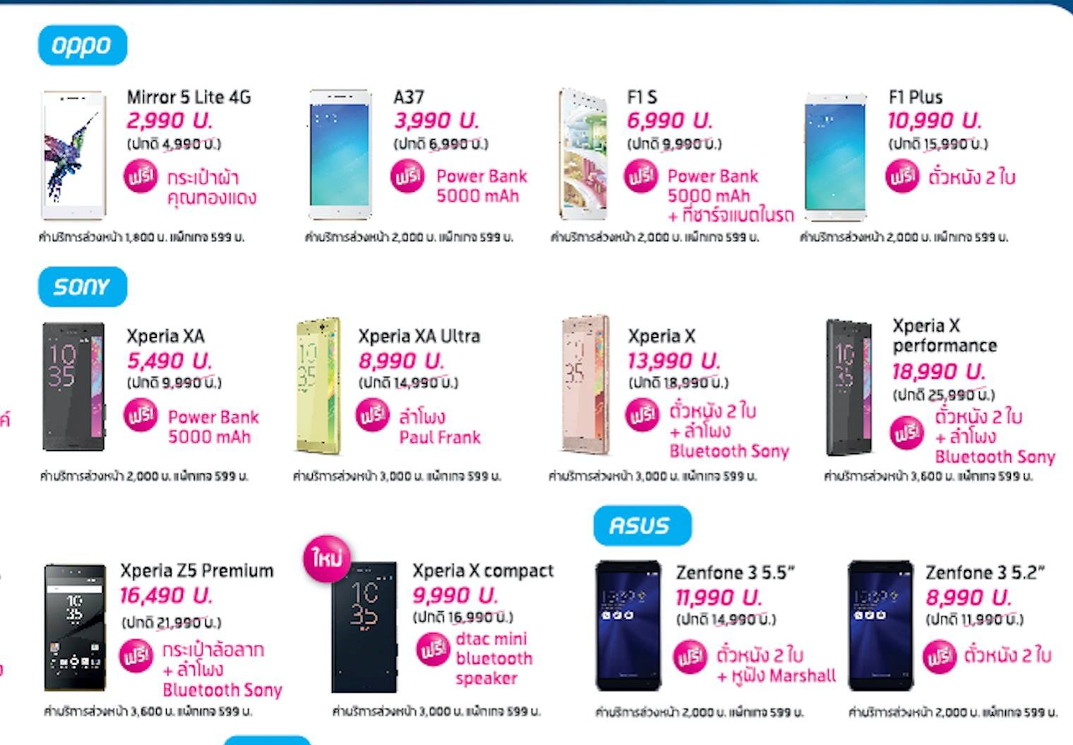 - OPPO F1S ราคาพิเศษ 6,990 บาท ของแถมเพียบ - Sony Xperia X series ลดเยอะ แถมเพียบ - ASUS Zenfone 3 ลดเยอะ แถมเพียบ