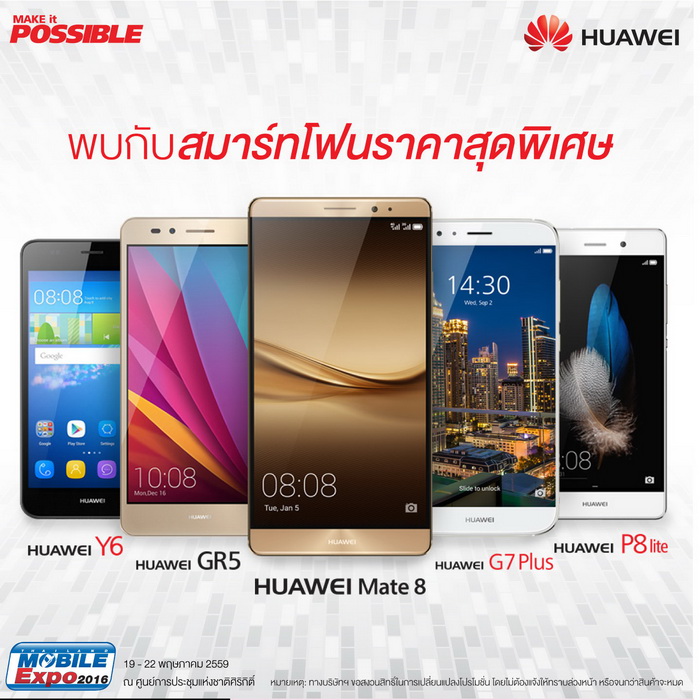 พบกับสมาร์ทโฟนราคาสุดพิเศษที่บูธ Huawei - Huawei Mate 8 - Huawei Y6 - Huawei GR5 - Huawei G7 Plus - Huawei P8 lite
