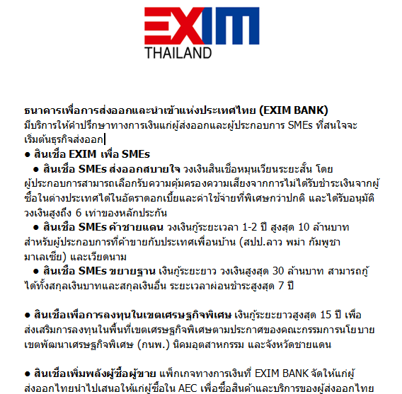 สินเชื่อเพิ่มพลังผู้ซื้อผู้ขาย ให้ผู้ส่งออกไทยนำไปเสนอให้แก่ผู้ซื้อใน AEC เพื่อซื้อสินค้าและบริการของผู้ส่งออกไทย