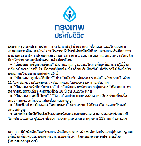 • บีแอลเอ พร้อมเกษียณ ประกันบำนาญรูปแบบใหม่เพื่อเตรียมพร้อมใช้ชีวิตหลังเกษียณอย่างมั่นใจ ซื้อง่ายเป็นยูนิต ซื้อครั้งละกี่ยูนิตก็ได้ เมื่อไหร่ก็ได้ ยิ่งซื้อเร็ว ยิ่งคุ้ม มั่นใจรับบำนาญสูงสุด 26 ปี