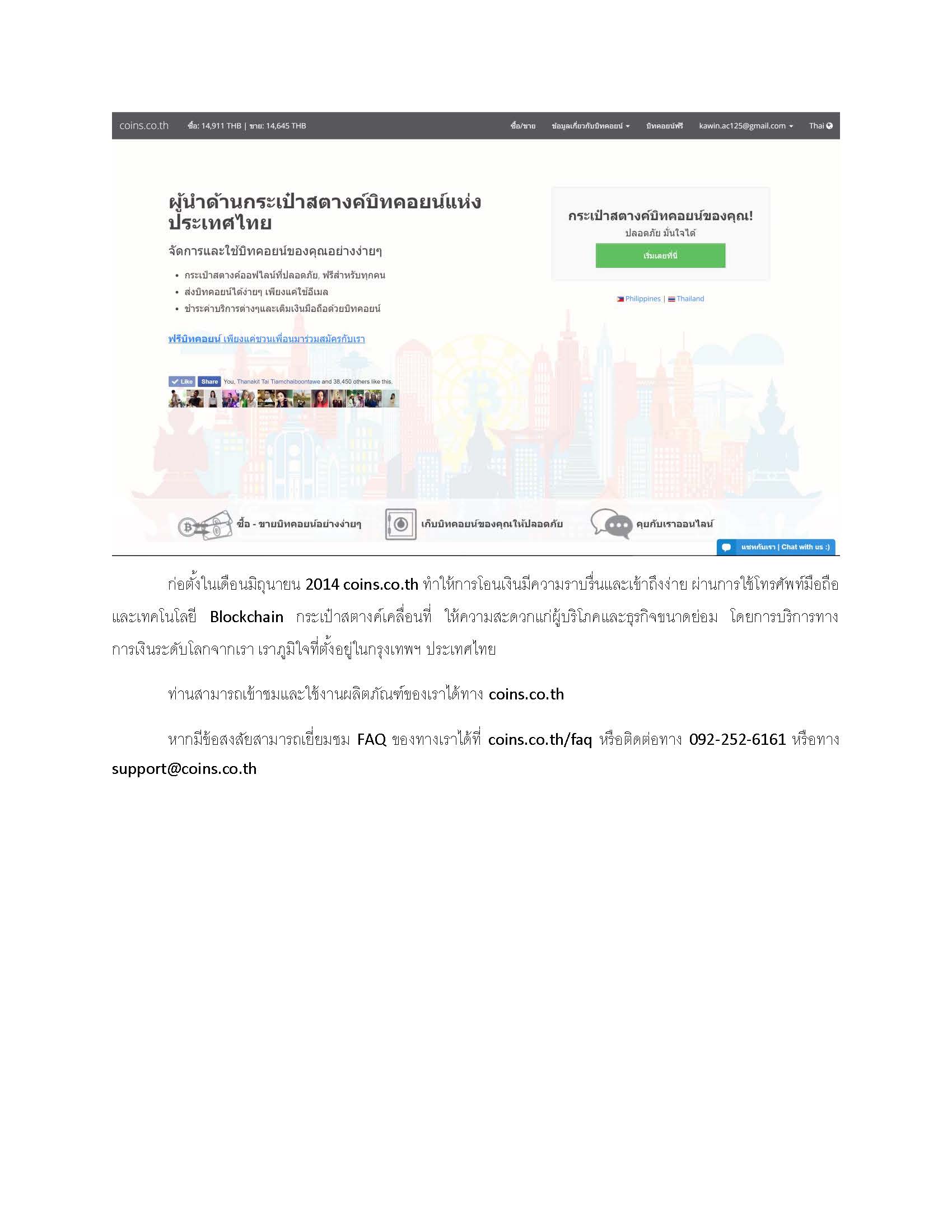 Product หลักของเราคือกระเป๋าสตางค์บิทคอยน์ซึ่งเป็นตัวกลางแลกเปลี่ยนบนอินเตอร์เน็ต ลูกค้าที่ใช้บริการของเราสามารถซื้อ/ขาย/โอน บิทคอยน์กับทางเราได้ โดยเรามีช่องทางต่างๆเพื่ออำนวยความสะดวกให้ลูกค้า ตั้งแต่การโอนผ่านบัญชีธนาคาร, Mobile Wallet ต่างๆ หรือแม้กระทั่งการใช้บิทคอยน์ในการซื้อ Sticker Line, ช๊อปปิ้งออนไลน์ที่ร้านค้าชั้นนำในประเทศไทย