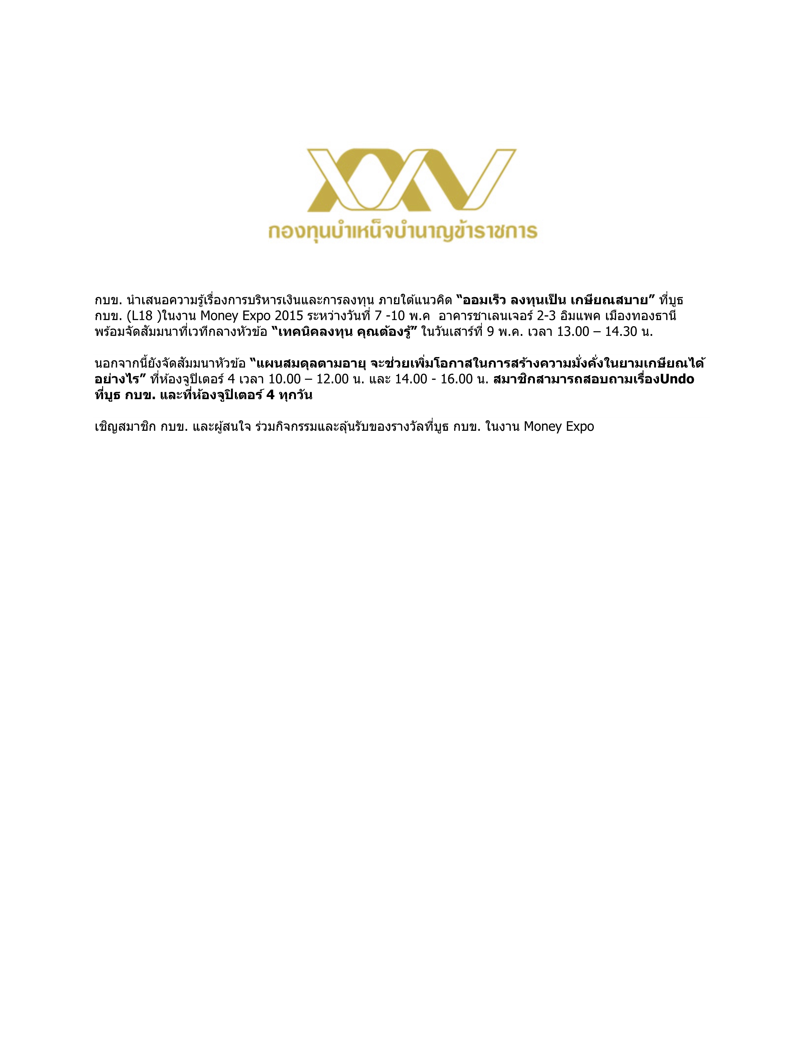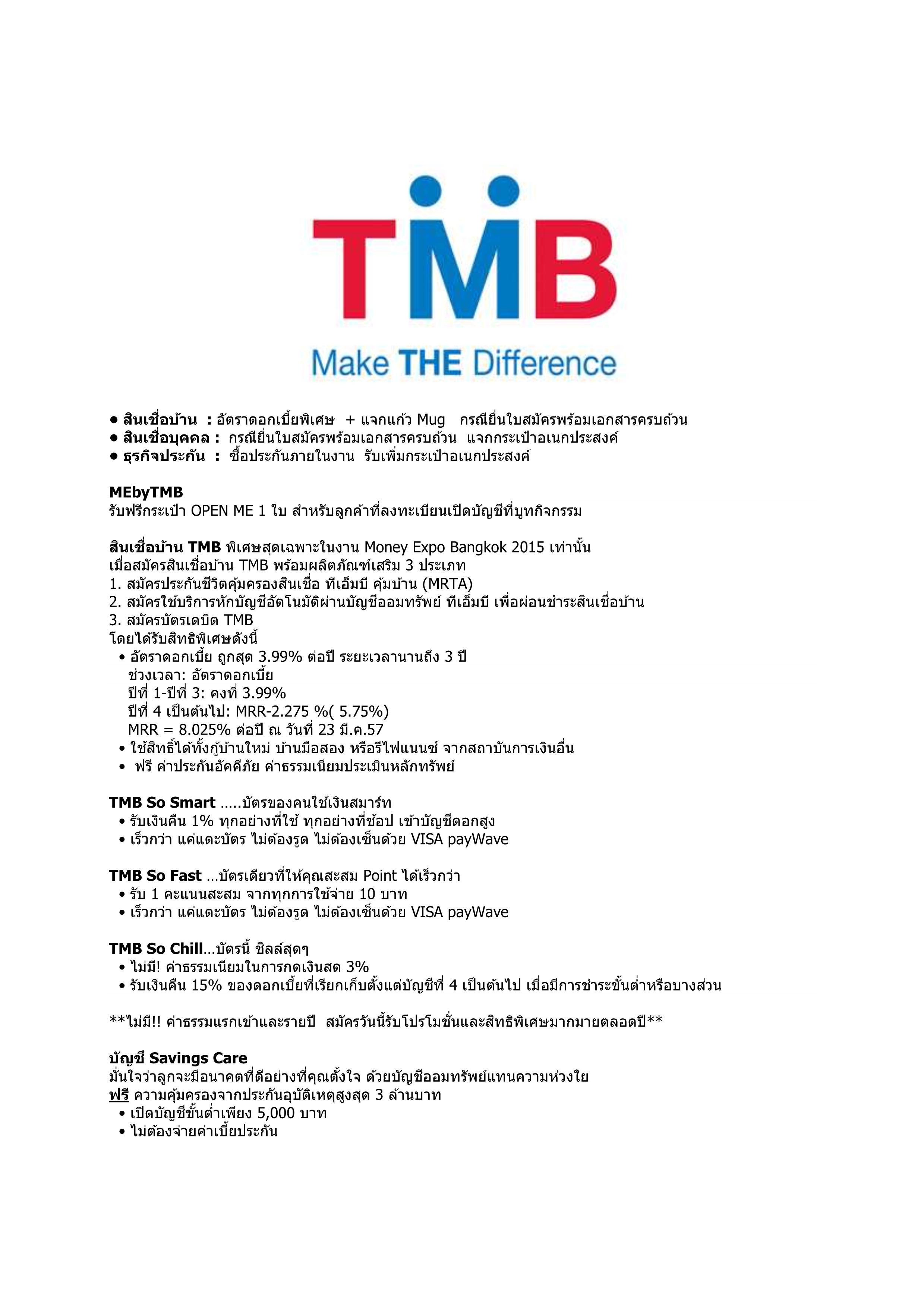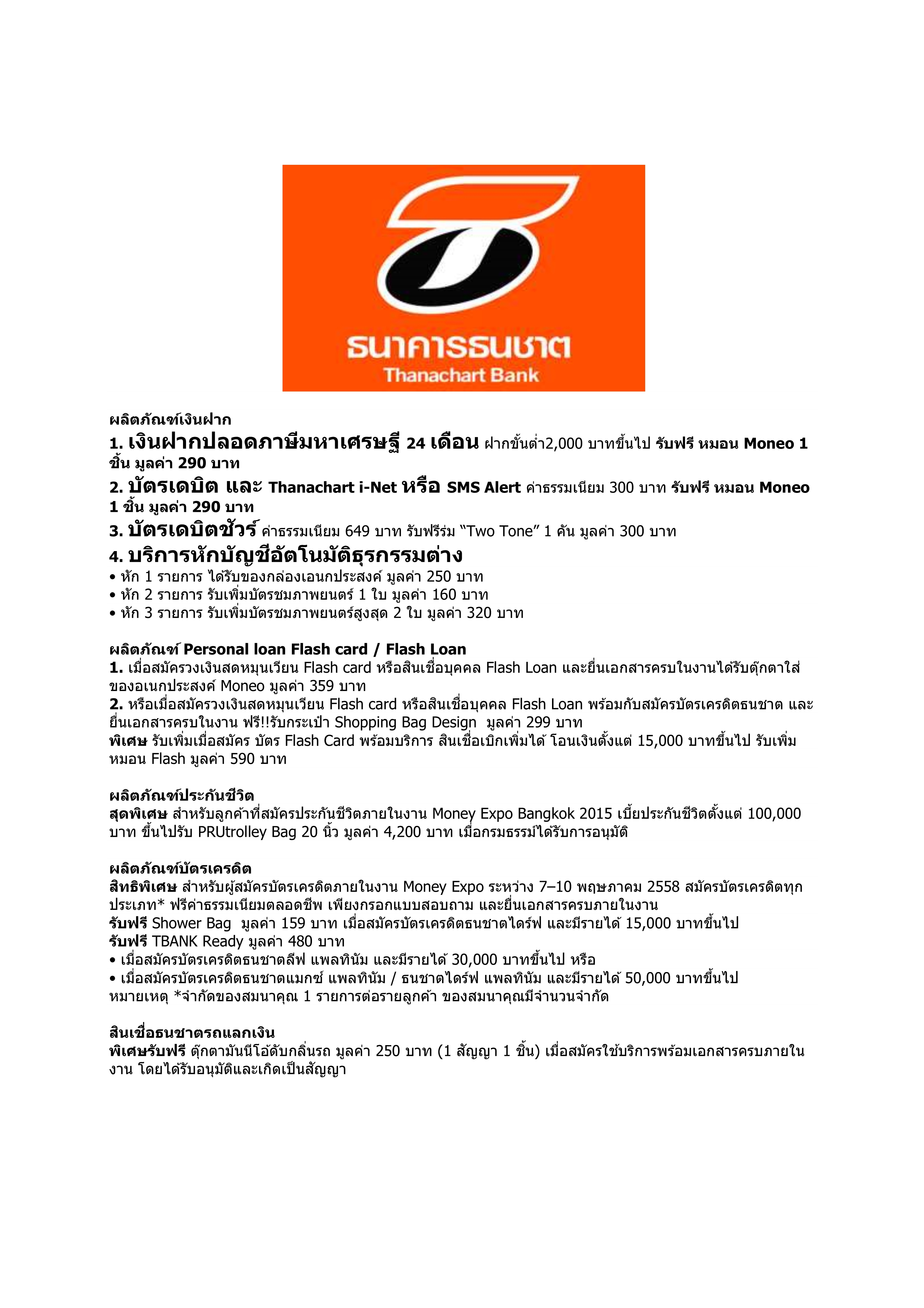 สำหรับลูกค้าที่สมัครประกันชีวิตภายในงาน Money Expo Bangkok 2015 เบี้ยประกันชีวิตตั้งแต่ 100,000 บาท ขึ้นไปรับ PRUtrolley Bag 20 นิ้ว มูลค่า 4,200 บาท เมื่อกรมธรรม์ได้รับการอนุมัติ