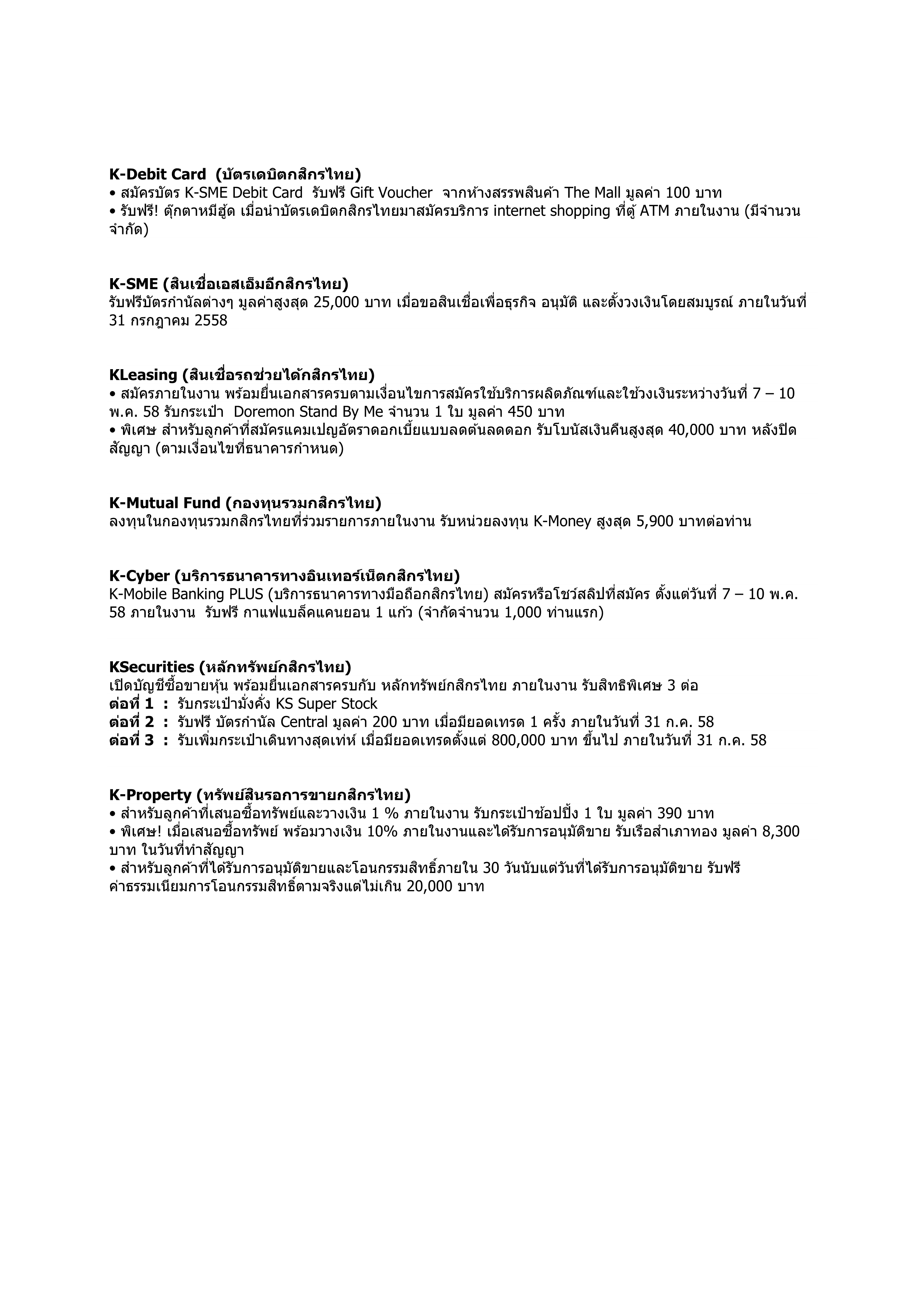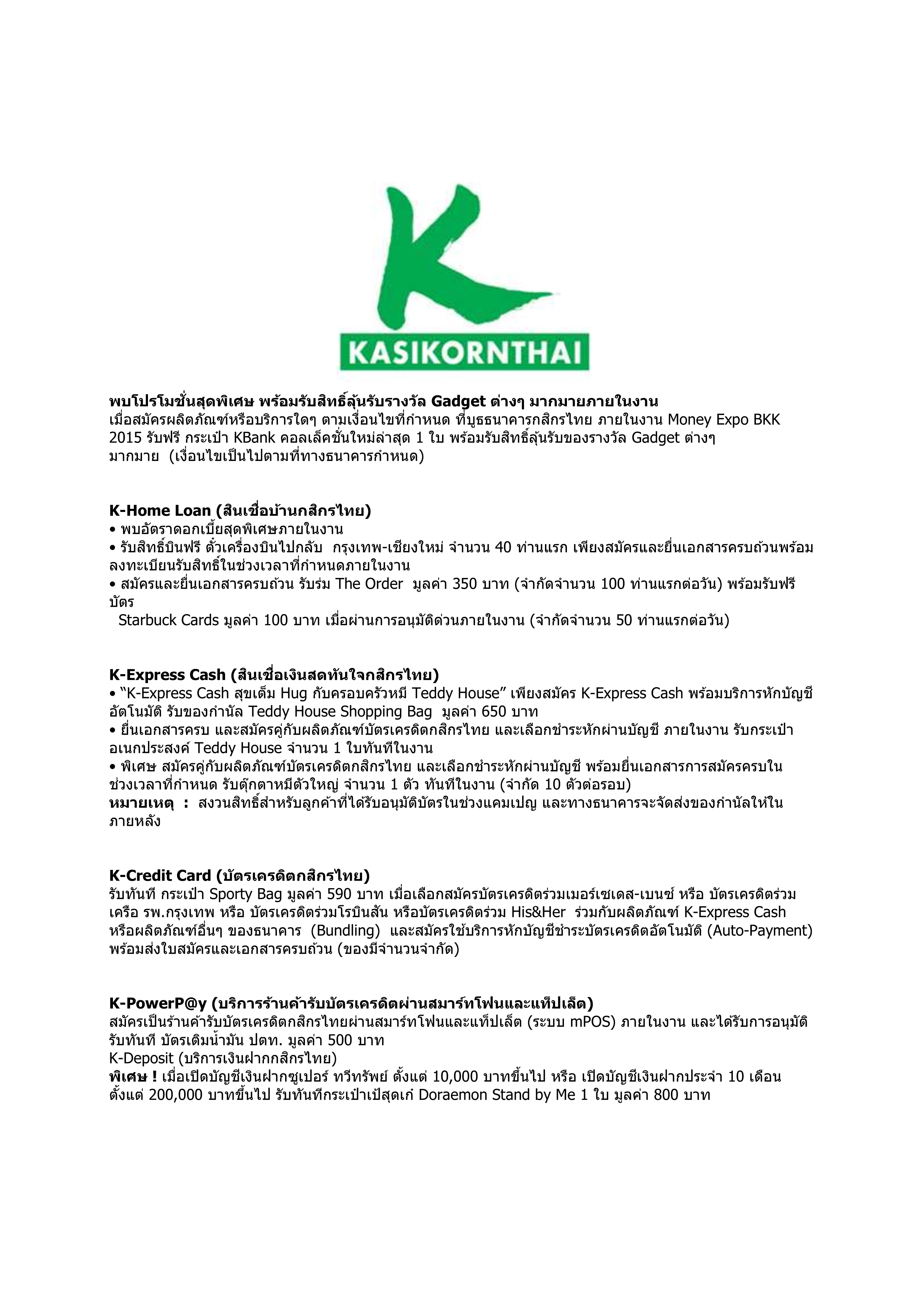 K-Express Cash (สินเชื่อเงินสดทันใจกสิกรไทย) สมัครคู่กับผลิตภัณฑ์บัตรเครดิตกสิกรไทย และเลือกชำระหักผ่านบัญชี พร้อมยื่นเอกสารการสมัครครบในช่วงเวลาที่กำหนด รับตุ๊กตาหมีตัวใหญ่ จำนวน 1 ตัว ทันทีในงาน (จำกัด 10 ตัวต่อรอบ)