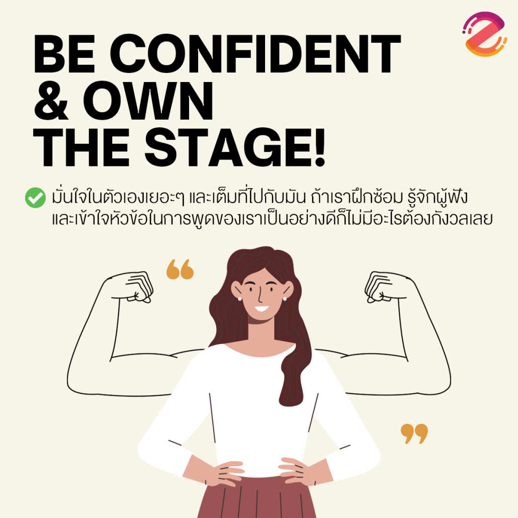 ปิดท้ายด้วยทริคที่สำคัญที่สุดจากซิป นั่นก็คือ ‘Be confident & Own the Stage!’ เราอยากให้ทุกๆ คนมั่นใจในตัวเองเยอะๆ และเต็มที่ไปกับมัน ถ้าเราฝึกซ้อม รู้จักผู้ฟัง และเข้าใจหัวข้อในการพูดของเราเป็นอย่างดีก็ไม่มีอะไรต้องกังวลเลย เพราะสิ่งที่เราตั้งใจและทุ่มเทลงไป สักวันหนึ่งมันจะตอบแทนเรากลับมาแน่นอน อย่าลืมว่า your work hard pays off ! ( ¨̮ )