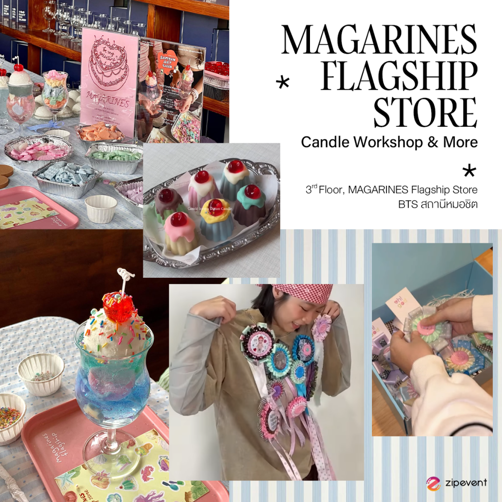 เริ่มกันที่ ‘MAGARINES FLAGSHIP STORE’ ร้านเวิร์กช็อปสุดเก๋ที่ฮอตสุดๆ ในตอนนี้ เพราะนอกจากทางร้านจะมีจัดเวิร์กช็อปแล้ว ที่นี่ยังเป็นร้านเสื้อผ้าและคาเฟ่อีกด้วย บอกเลยว่าบรรยากาศภายในร้านน่ารักและอบอุ่นสุดๆ โดยเวิร์กช็อปที่ทางร้านจัดขึ้นจะมีเป็น Candle Workshop ทั้งดีไซน์ cake, jelly, pizza, melon soda และอื่นๆ อีกเพียบ ทั้งยังเวิร์กช็อปน้องใหม่อย่าง Rosette Ribbon Workshop ในเดือนมกราคมอีกด้วย หากใครสนใจก็สามารถติดตามรายละเอียดที่ทางไอจีของทางร้านได้เลย!