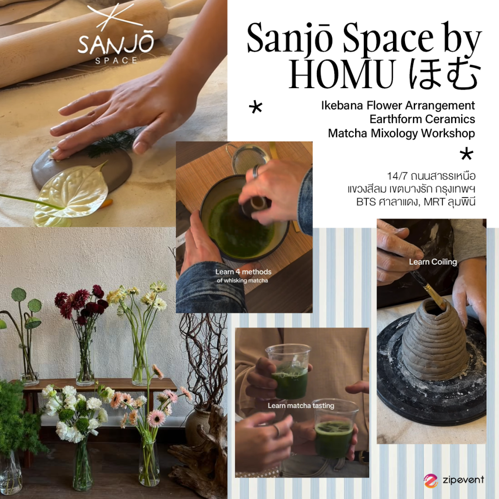 ไปกันต่อที่ ‘Sanjō Space by HOMUほむ’ เวิร์กช็อปสเปซแห่งใหม่ที่ซ่อนตัวอยู่ใน HOMUほむ คาเฟ่มัทฉะย่านสีลม! ภายในร้านถูกตกแต่งตามสไตล์ญี่ปุ่นผสานไปกับความเรียบง่าย บรรยากาศเลยอบอวลไปด้วยความอบอุ่นและเป็นกันเอง โดยที่นี่จะมีเวิร์กช็อปให้เลือกหลากหลายมากๆ ไม่ว่าจะเป็นการจัดดอกไม้สไตล์ Ikebana, การปั้นเซรามิก หรือการชงและคิดสูตรมัทฉะ บอกเลยว่าเป็นเวิร์กช็อปที่คงคอนเซปต์ความเป็นญี่ปุ่นไว้ได้ดีสุดๆ เหมือนเราได้ทั้งใช้เวลากับตัวเอง ได้ลองทำอะไรใหม่ๆ ไปพร้อมกับการเรียนรู้วัฒนธรรมญี่ปุ่นไปด้วย ใครที่กำลังหาเวิร์กช็อปทำอยู่ บอกเลยว่าต้องห้ามพลาดจริงๆ ( ¨̮ )