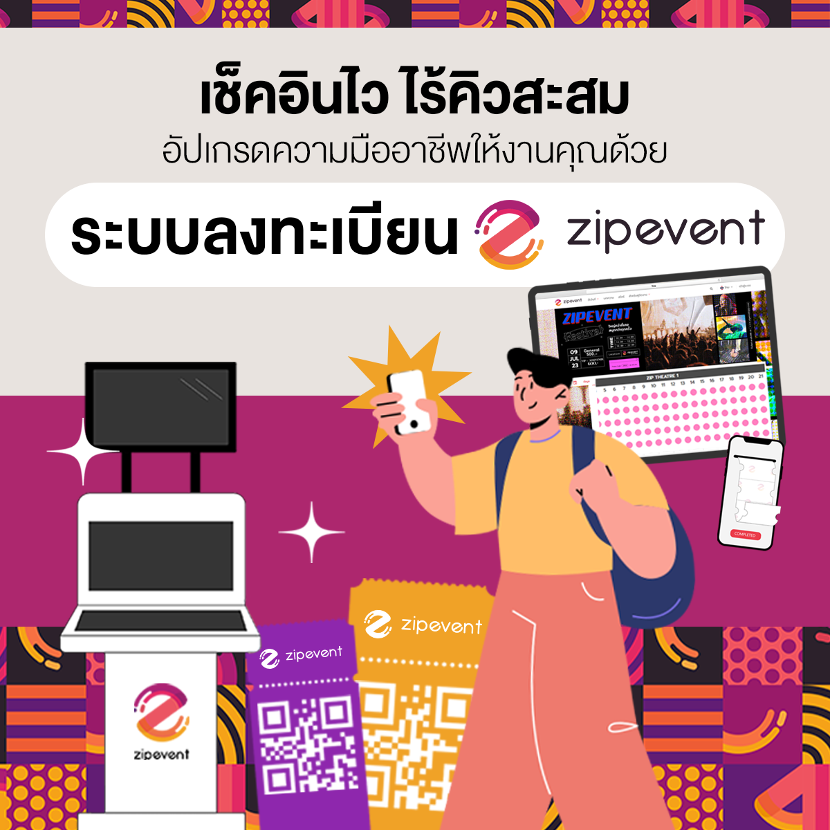 คนเยอะแค่ไหนก็ไม่หวั่น หมดปัญหาเช็คอินที่ยุ่งเหยิง! เตรียมทำให้ Flow หน้างานสมูทกว่าเดิมด้วย ‘ระบบลงทะเบียนอีเว้นท์ Zipevent’ ตัวช่วยที่จะเปลี่ยนจุดลงทะเบียนธรรมดาๆ ให้ดูโปรและรวดเร็วขึ้นทันตาเห็น ไม่ปล่อยให้ผู้ร่วมงานต้องเสียเวลารอคิวนาน ช่วยสร้าง First Impression ที่ดีเยี่ยมให้กับงานของคุณตั้งแต่วันแรก พร้อมอัปเกรดงานของคุณให้มืออาชีพยิ่งกว่าที่เคย!