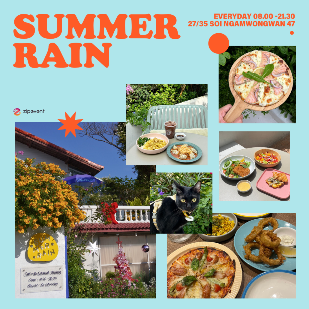 ปิดท้ายด้วย ‘Summer Rain Cafe & Restaurant’ คาเฟ่สุดน่ารักที่มีบรรยากาศน่ารักจนอยากกลับไปอีกหลายๆ ครั้ง! ที่นี่มาพร้อมกับโซน Indoor ที่ตกแต่งด้วยโทนสีขาวน่ารัก และ Outdoor ที่ให้ความรู้สึกเหมือนนั่งอยู่ในสวนดอกไม้ เหมาะกับการมานั่งชิลตลอดวัน แวะมาได้ทั้งมื้อเช้า กลางวัน และเย็น บอกเลยว่าไม่ว่าจะตอนไหนก็มู้ดดีไม่แพ้กัน