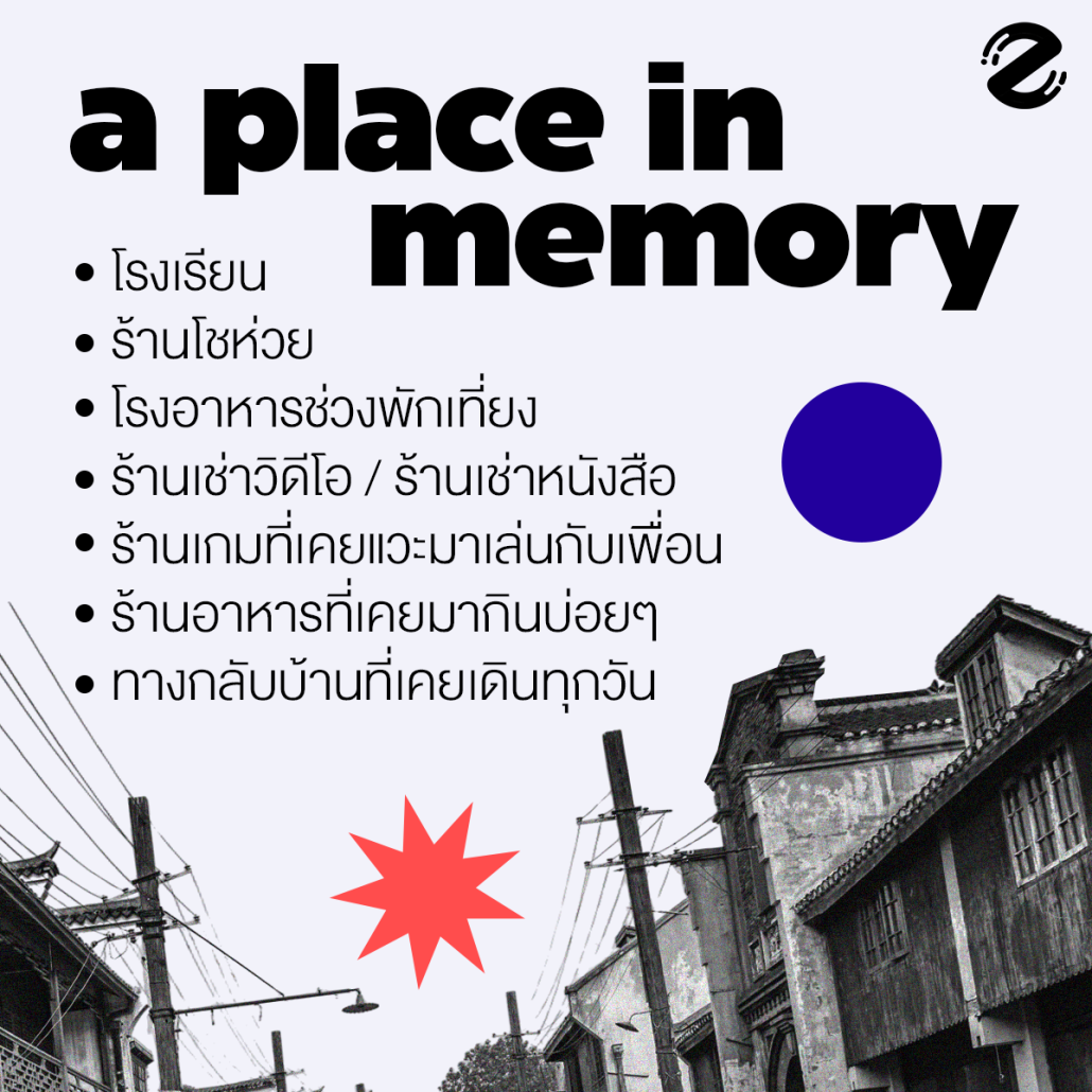 อาจจะเป็นโรงเรียนที่เคยไปทุกวันตั้งแต่มอต้นจนมอปลาย อาจจะเป็นโรงออาหารช่วงพักเที่ยงที่เต็มไปด้วยคน เสียง และความวุ่นวายแบบคูณสิบ แถมยังมาพร้อมกับแถวยาวๆ ที่ถ้าอยากกินยังไงก็ต้องรอ อาจจะเป็นร้านเช่าวิดีโอหรือร้านเช่าหนังสือที่เราได้เดินเลือกด้วยตัวเอง อาจจะเป็นร้านเกมที่เคยแวะมาเล่นกับเพื่อนหลังเลิกเรียนบ่อยๆ หรืออาจจะเป็นแค่บรรยากาศทางกลับบ้านที่เคยเดินทุกวันจนกลายเป็นความเคยชิน