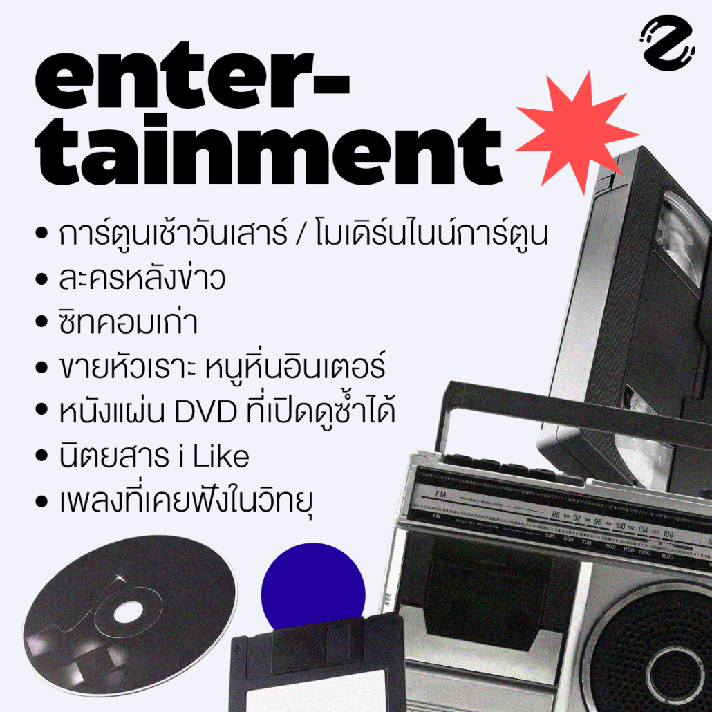 แล้วหนึ่งในนี้มีอะไรที่ทุกคนคิดถึงกันบ้างนะ การ์ตูนเช้าวันเสาร์ โมเดิร์นไนน์การ์ตูน ละครหลังข่าว ซิทคอมเก่าๆ อย่างบ้านนี้มีรัก บางรักซอยเก้า เฮงเฮงเฮง หรือจะเป็นการ์ตูนเล่มจิ๋วที่หาซื้อได้ตาม 7-eleven อย่าง ขายหัวเราะ หนูหิ่นอินเตอร์ บางทีอาจจะเป็นหนังแผ่น DVD ที่เปิดดูซ้ำๆ จนเป็นรอย นิตยสาร i Like กับปกโทนสีสันที่ซื้อมาเก็บจนเต็มห้อง หรืออาจจะเป็นช่องวิทยุที่พยายามเปลี่ยนช่องจนกว่าจะเจอเพลงที่ถูกใจ อย่าง EFM 94, Green Wave 106.5, Hotwave 91.5