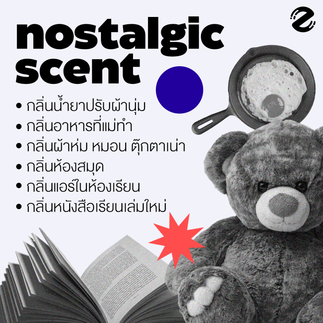 อาจจะเป็นแค่กลิ่นน้ำยาปรับผ้านุ่มที่เมื่อก่อนเคยใช้บ่อยๆ แต่ตอนนี้เปลี่ยนแล้ว กลิ่นเมนูโปรดที่แม่ชอบทำให้กินบ่อยๆ กลิ่นผ้าห่ม หมอน หรือตุ๊กตาเน่าที่ไม่อยากให้ซัก เพราะกลิ่นจะหายไป หรือกลิ่นในช่วงวัยเรียนที่ชวนให้เห็นภาพความทรงจำได้ชัดที่สุด อย่างกลิ่นห้องสมุด กลิ่นแอร์ในห้องเรียน หรือกลิ่นหนังสือเรียนเล่มใหม่ที่ได้รับวันแรกของการเปิดเทอม