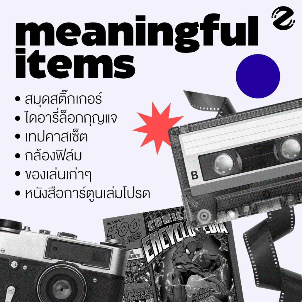 อาจจะเป็นอะไรที่เรียบง่ายอย่างการ์ดวันเกิดหรือส.ค.สที่เพื่อนเคยเขียนให้ สมุดสติ๊กเกอร์ที่ซื้อมาจนล้นบ้าน ไอดารี่ที่มีกุญแจล็อกเพิ่มความเป็นส่วนตัวแบบคูณสิบ เทปคาสเซ็ตที่เมื่อก่อนเคยเปิดฟังบ่อยๆ อาจจะเป็นกล้องฟิล์มที่ได้มาต่อมาจากคุณพ่อคุณแม่ หรือของใช้สมัยเรียน อย่างกล่องดินสออันโปรด ปากกา ยางลบ ไม้บรรทัดที่แม้ตอนนี้จะไม่ได้ใช้แล้ว แต่ก็ทิ้งไม่ลงอยู่ดี