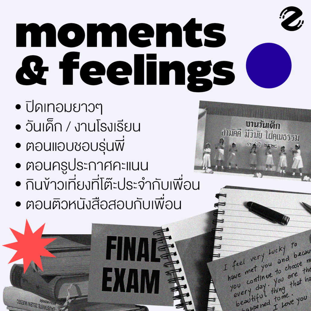 บางทีก็อาจเป็นความรู้สึกทั้งตื่นเต้นทั้งกลัวตอนครูประกาศคะแนนหรือตอนดูผลสอบเข้ามหาลัย อาจเป็นช่วงเวลาพักเที่ยงที่อยู่ๆ ก็ชวนให้นึกถึงตอนได้กินข้าวเที่ยงที่โต๊ะประจำกับเพื่อน หรือบางแว้บที่ต้องตื่นนอนเพราะนาฬิกาปลุก แต่ในตอนนั้นชอบแอบนอนต่อ แต่รีบลุกทัน เพราะได้ยินเสียงแม่กำลังเดินมา