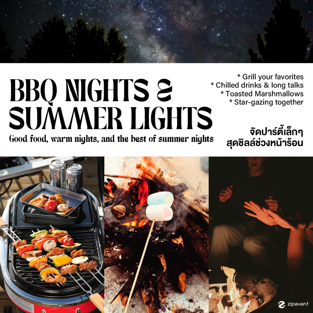 ใครที่ไม่อยากออกไปไหนแต่ก็มีฟีลอยากดื่มด่ำกับซัมเมอร์ ลองจัดเป็นฟีล ‘BBQ Nights & Summer Lights’ ปาร์ตี้เล็กๆ ที่ชวนเพื่อนออกมาแฮงค์เอาท์ด้วยกันท่ามกลางบรรยากาศสุดชิลล์ช่วงหน้าร้อน! อาจจะแค่ทำข้าวเย็นกินด้วยกัน ย่างบาร์บีคิว ซื้อขนมมากินด้วยกัน หรือได้นั่งจิบเบียร์ดื่มเครื่องดื่มเย็นๆ คุยกันไปเรื่อยเปื่อย แค่นี้ก็คงจะเป็นอะไรที่รู้วึกเหมือนว่าได้พักผ่อน ได้ชาร์จแบตให้ตัวเองแล้ว เพราะมันคงจะทำให้เรามีความสุขมากไม่แพ้การได้ออกไปเที่ยวข้างนอกเลย ( ¨̮ )