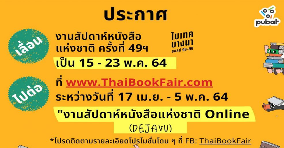 ‘ งานสัปดาห์หนังสือแห่งชาติครั้งที่ 49 ‘ เลื่อนแล้วนะ! หลายคนคงเริ่มได้ยินข่าวคราวของการประกาศเลื่อนของ ‘ งานสัปดาห์หนังสือแห่งชาติครั้งที่ 49 ‘ ที่กำลังจะจัดขึ้นในวันที่ 17 – 25 เมษายน 2564 ที่ Bitec Bangna Hall…