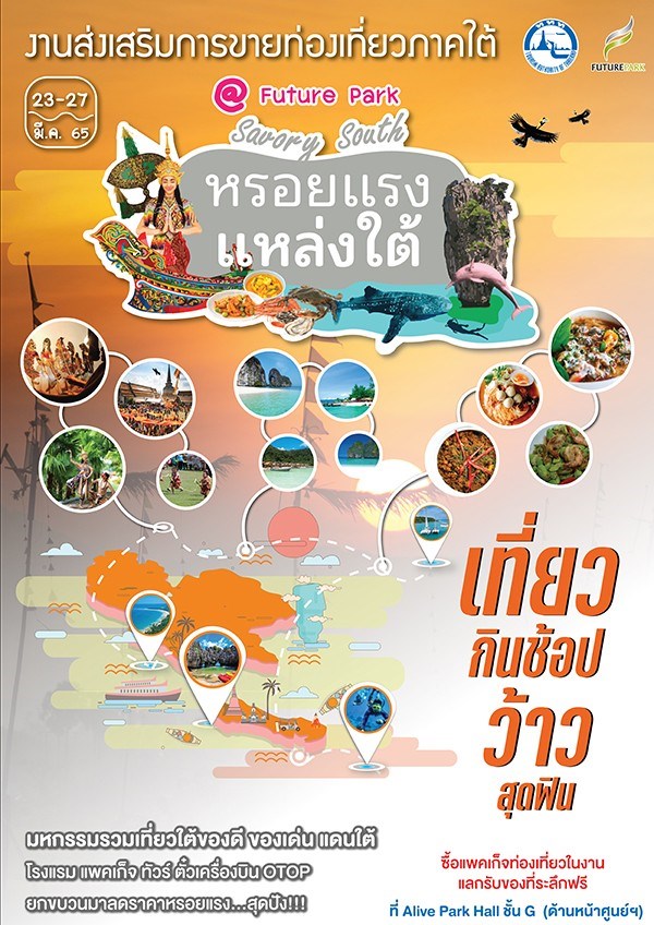 ศูนย์การค้าฟิวเจอร์พาร์คร่วมกับการท่องเที่ยวแห่งประเทศไทย เชิญสัมผัสบรรยากาศ ภูมิภาคภาคใต้ จัดกิจกรรมส่งเสริมการขายท่องเที่ยวภาคใต้ เที่ยว กิน ช้อป กับงาน "หรอยแรง แหล่งใต้" จัดขึ้นระหว่างวันที่ 23 - 27 มีนาคม 2565 ณ Alive Hall ชั้น G ศูนย์การค้าฟิวเจอร์พาร์ค