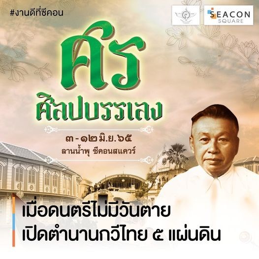 ศร ศิลปบรรเลง วันที่ 3 - 12 มิถุนายน 2565 ณ ซีคอนสแควร์ ย้อนรอยเส้นทางชีวิตของ ‘ศร ศิลปบรรเลง’ หรือ ‘หลวงประดิษฐ์ ไพเราะ’ หนึ่งในบรมครูเพลง ผู้มีอัจฉริยภาพและคุณูปการต่อวงการดนตรีไทย สัมผัสบรรยากาศ ๔ ช่วงเวลาสำคัญในยุคสมัยที่ดนตรีไทยเฟื่องฟู ตั้งแต่ครั้งสมัยรัชกาลที่ ๕ จวบจนรัชกาลที่ ๙ ไม่ว่าจะเป็น วิถีชีวิตอัมพวา ลุ่มแม่น้ำกลอง ถิ่นทองของดนตรีไทย, โรงดนตรีแห่งวังบูรพาภิรมย์, เรือนบรรเลง และหลุมหลบภัยหัวลำโพง เต็มอิ่มไปกับการแสดงชีวประวัติผ่านหุ่นละครเล็กคลองบางหลวงและการแสดงระนาดขุนอิน พร้อมดื่มด่ำรสชาติความเป็นไทยด้วยการลิ้มรสเมนูอาหารคาวหวานแสนอร่อย และอื่น ๆ อีกมากมาย ณ ลานน้ำพุ ชั้น 1 ซีคอนสแควร์