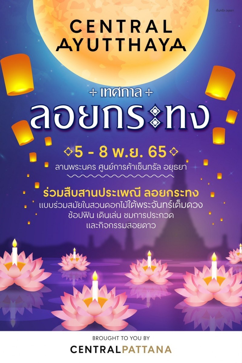 มาร่วมสืบสานประเพณีลอยกระทงแบบร่วมสมัย ในสวนดอกไม้ ใต้แสงจันทร์ ช้อปฟิน เดินชิล ถ่ายรูปกับเช็คอินกับพระจันทร์เต็มดวง พร้อมสนุกไปกับโชว์เต้นสไตล์ไทยร่วมสมัย, การประกวดนางฟ้าจำแลง และความน่ารักของหนูน้อยลอยกระทง เทศกาลลอยกระทง เซ็นทรัล อยุธยา วันที่ 5 - 8 พฤศจิกายน 2565 เวลา 4 โมงเย็น ถึง 4 ทุ่ม ณ ลานพระนคร ชั้น G เซ็นทรัล อยุธยา