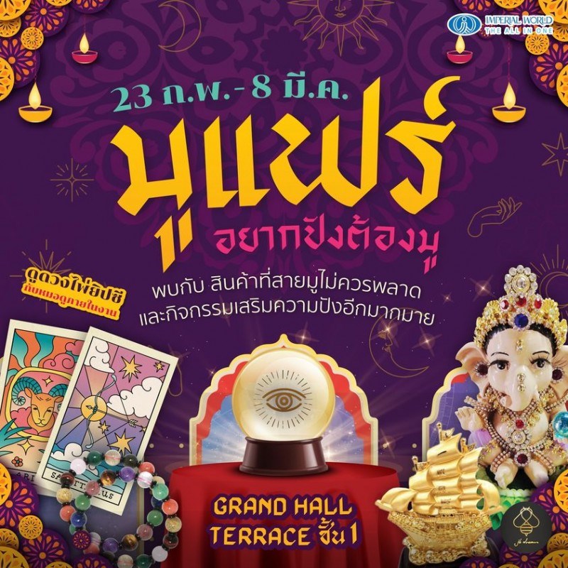มูแฟร์ อยากปังต้องมู สายมูไม่ควรพลาด รวมสินค้าของบูชา ที่สายมูต้องมี และกิจกรรมเสริมความปังอีกมากมาย ตั้งแต่วันนี้ - 8 มี.ค. 65 เวลา 10.30 - 20.00 น. ณ บริเวณ Grand Hall , Terrace ชั้น 1 ศูนย์การค้าอิมพีเรียล เวิลด์ สำโรง