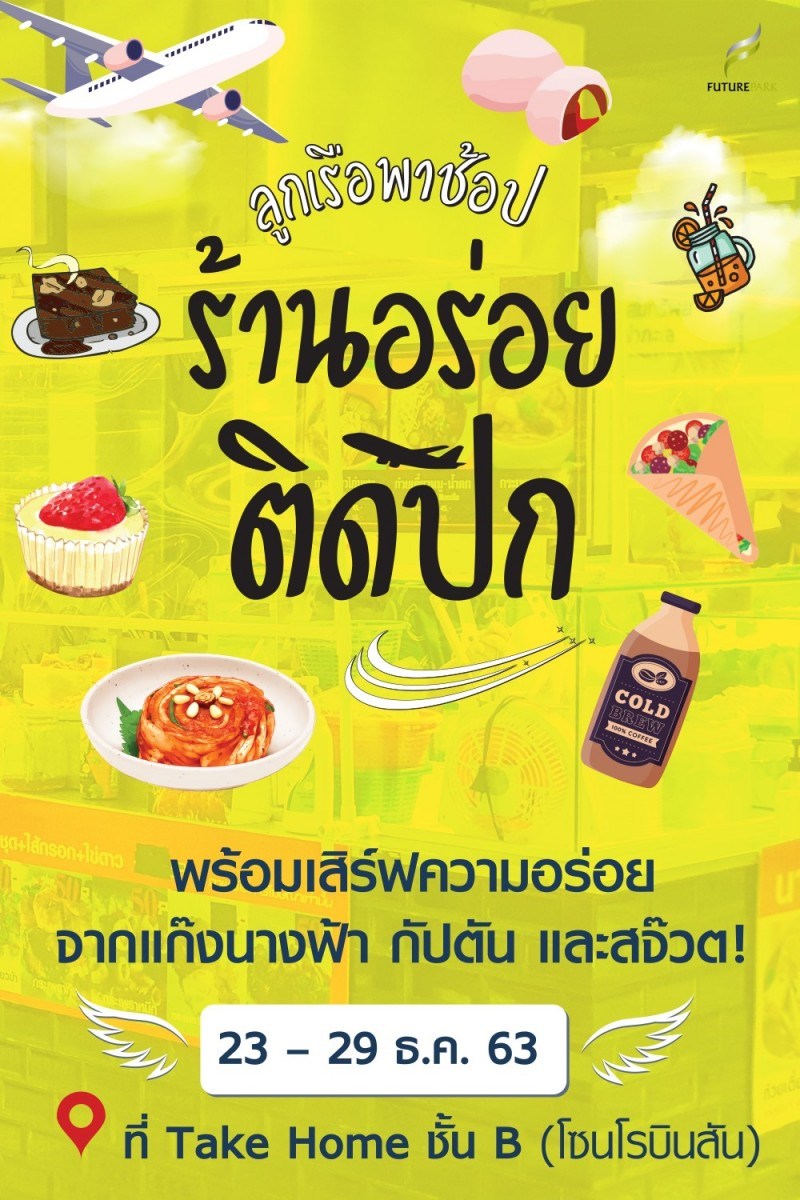 ร้านอร่อยติดปีก วันที่ 23 - 29 ธันวาคม 2563 ณ Take Home ชั้น B โซนโรบินสัน ฟิวเจอร์พาร์ค ร้านอร่อยติดปีกกลับมาอีกครั้ง!! กับหลากหลายร้าน หลากหลายเมนู พร้อมเสริฟความอร่อยจากแก๊งค์นางฟ้า กัปตัน ให้ทุก ๆ คนได้ลองชิม ไส้อั่วกัปตันเบิร์ด เหมยธัญพืช ไก่ตุ๊ก ไก่ทอดสมุนไพรอยุธยา Little Sweet Daifuku Patty Cold Brew It’s Good Bakery Captain Roaster Waffle Corner เครปไส้แตก ลูกชิ้นไม้พอเพียง เปี๊ยะลาวาไข่เค็ม บัวหิมะ ฮยองเจกิมจิ ขนมบ้านย่า ขนมจีนน้ำยาปู นู๋กระต่าย ติ๋มปลาสลิด คุณใหม่ อาหารทะเลแปรรูป