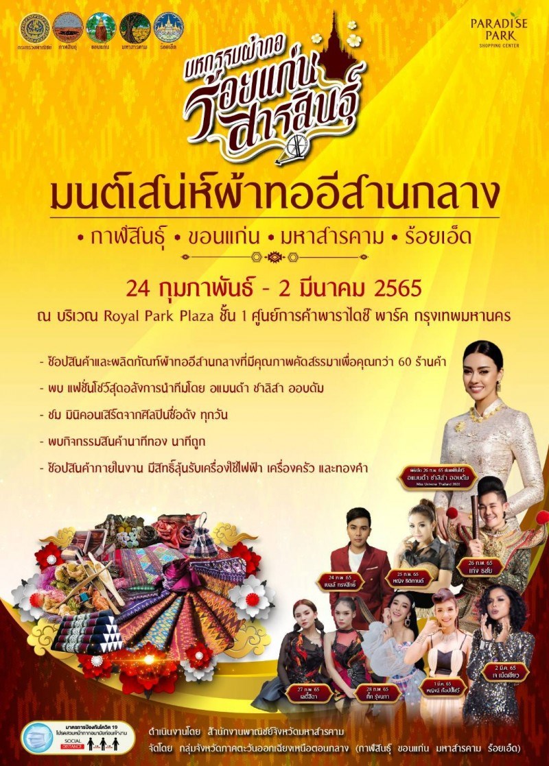 ศูนย์การค้าพาราไดซ์ พาร์ค ชวนคุณมาช้อปสินค้าผ้าทอ และผลิตภัณฑ์จากผู้ประกอบการกลุ่มจังหวัดตะวันออกเฉียงเหนือตอนกลาง ได้แก่ กาฬสินธุ์ ขอนแก่นมหาสารคาม และร้อยเอ็ด กว่า 60 ร้านค้า ที่มีความโดดเด่น ด้วยเอกลักษณ์ของผ้าที่มีลวดลายหลากหลายแตกต่างตามกรรมวิธีการทอที่สืบต่อกันมา ภายในงานยังมีกิจกรรมที่น่าสนใจ อาทิ การจัดนิทรรศการผลิตภัณฑ์ผ้าทอและวิถีผ้าทออีสานกลาง การแสดงมินิคอนเสิร์ตจากศิลปินที่มาร่วมสร้างสีสัน อาทิ เก่ง ธชย หญิง ธิติกานต์ เลดี้ สีดา เบลล์ ทรงสิทธิ์ เจเน็ต เขียว กิ๊ก รุ่งนภา และหญิงลี ก๊อปปี้โชว์ กิจกรรมนาทีทอง ร่วมชิงโชคลุ้นรับทองคำ 1 บาท พิธีเปิดงานวันเสาร์ที่ 26 กุมภาพันธ์ 2565 เวลา 16.00 น. พบกับ "อแมนด้า ชาลิสา ออบดัม" มิสยูนิเวิร์สไทยแลนด์ 2020 มาร่วมเดินแฟชั่นโชว์ ในชุดผ้าทออีสานกลาง มีความสวยงาม และอัตลักษณ์