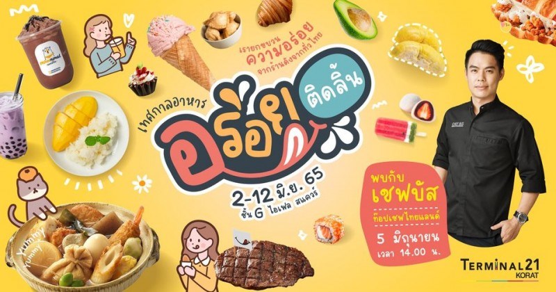 เทศกาลอาหารอร่อยติดลิ้น วันที่ 2 - 12 มิถุนายน 2565 ณ Terminal21 Korat Shopping Mall ยกขบวนพาเหรด ของอร่อยทั่วไทยในงาน เทศกาลอาหารอร่อยติดลิ้น วันที่ 2 - 12 มิ.ย. 65 ณ ชั้น G ไอเฟล สแควร์ อร่อย..กินฟรี คูปองเงินสด มูลค่า 20 บาท สามารถใช้เป็นส่วนลด ภายในงาน อร่อยติดลิ้น เพียงถ่ายรูป Check in ภายในงาน จำกัด 20 สิทธิ์/วัน เท่านั้น (1 คน / สิทธิ์ / ตลอดโปรโมชั่น) อร่อย..ระดับเชฟ 5 มิ.ย. 65 เวลา 14.00 น. พบกับ เชฟบัส จากรายการ TOP CHEF THAILAND ที่จะมารังสรรค์เมนูสุดพิเศษ พร้อมชิมฟรี 21 สิทธิ์/วัน (เฉพาะวันที่ 5 มิ.ย. 65 เท่านั้น) 12 มิ.ย. เวลา 12.30 น. เป็นต้นไป ชมการแข่งขัน Bollywood Cover Challenge การแต่งกายในแบบวัฒนธรรมประเทศอินเดีย อายุระหว่าง 4 -12 ปี ชิงทุนการศึกษามูลค่ากว่า 15,000 บาท สนใจสมัคร https://bit.ly/3wZEthC