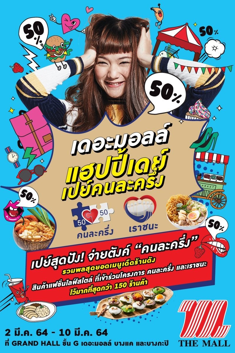 เดอะมอลล์ แฮปปี้เดย์ เปย์คนละครึ่ง วันที่ 2 - 10 มีนาคม 2564 ณ GRAND HALL ชั้น G เดอะมอลล์ บางแค ชาวเดอะมอลล์ ช้อป ชิม ฟิน แบบสบายกระเป๋า เดอะมอลล์ แฮปปี้เดย์ เปย์คนละครึ่ง เปย์สุดปัง! จ่ายตังค์ "คนละครึ่ง" รวมพลสุดยอดร้านอาหารสตรีทฟู๊ด และสินค้าไลฟ์สไตล์ ที่เข้าร่วมโครงการ "คนละครึ่ง" และ "เราชนะ" ไว้มากที่สุด กว่า 150 ร้านค้า