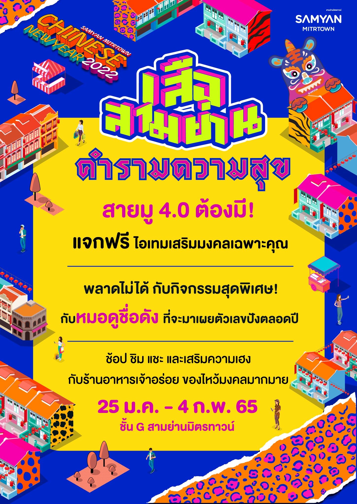 เสือสามย่านคำรามความสุข วันที่ 25 ม.ค. - 4 ก.พ. 2565 สามย่านมิตรทาวน์ ช้อปชิมแชะและเสริมความเฮงกับร้านอาหารเจ้าอร่อยของไหว้มงคลมากมาย พร้อมกับหมอดูชื่อดังที่จะมาเผยตัวเลขสุดปังตลอดปี ในงานนี้ยังถ่ายรูปคู่ น้องฟู่ (富) เสือแห่งความร่ำรวยสุดคิวท์ สีสันสดใสยืนเด่นสูง 5 เมตร อยู่บริเวณด้านหน้าสามย่านมิตรทาวน์