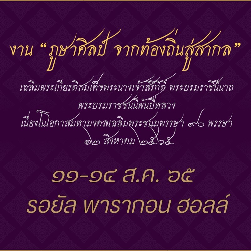 กระทรวงวัฒนธรรมได้ร่วมกับหน่วยงานต่าง ๆ จัดงาน "ภูษาศิลป์ จากท้องถิ่นสู่สากล" ระหว่างวันที่ 11 - 14 ส.ค. ที่ รอยัล พารากอน ฮอลล์ ชั้น 5 ศูนย์การค้าสยามพารากอน เพื่อเฉลิมพระเกียรติ สมเด็จพระนางเจ้าสิริกิติ์ พระบรมราชินีนาถ พระบรมราชชนนีพันปีหลวง เนื่องในโอกาสมหามงคลเฉลิมพระชนมพรรษา 90 พรรษา 12 ส.ค. 2565 พบกับกิจกรรมภายในงานมากมาย อาทิ นิทรรศการเฉลิมพระเกียรติสมเด็จพระนางเจ้าสิริกิติ์ พระบรมราชินีนาถ พระบรมราชชนนีพันปีหลวง นิทรรศการผ้าไทยลายอัตลักษณ์ 76 จังหวัด นิทรรศการผลิตภัณฑ์วัฒนธรรมไทย (Cultural Product of Thailand : CPOT) นิทรรศการผ้าไทยร่วมสมัย การเสวนาวิชาการ การสาธิต การจำหน่ายผ้าไทยและผลิตภัณฑ์จากผ้า การจัดทำหนังสือ "ผ้าไทยลายอัตลักษณ์ 76 จังหวัด" การแสดงศิลปวัฒนธรรมไทย การแสดงจินตลีลาพัสตราภรณ์ : มโนราห์บัลเลต์ และการขับร้องดนตรี วงเฉลิมราชย์ การแสดงแบบผ้าไทยลายอัตลักษณ์และการแสดงแบบผ้าไทยร่วมสมัย การเจรจาทางธุรกิจ ทั้งภายในประเทศและต่างประเทศ รวมไปถึงการสาธิตการทอผ้า การออกร้านจำหน่ายผ้าไทย เสวนาวิชาการเกี่ยวกับผ้าไทย ฝ่าวิกฤติ สร้างรายได้ เป็นต้น