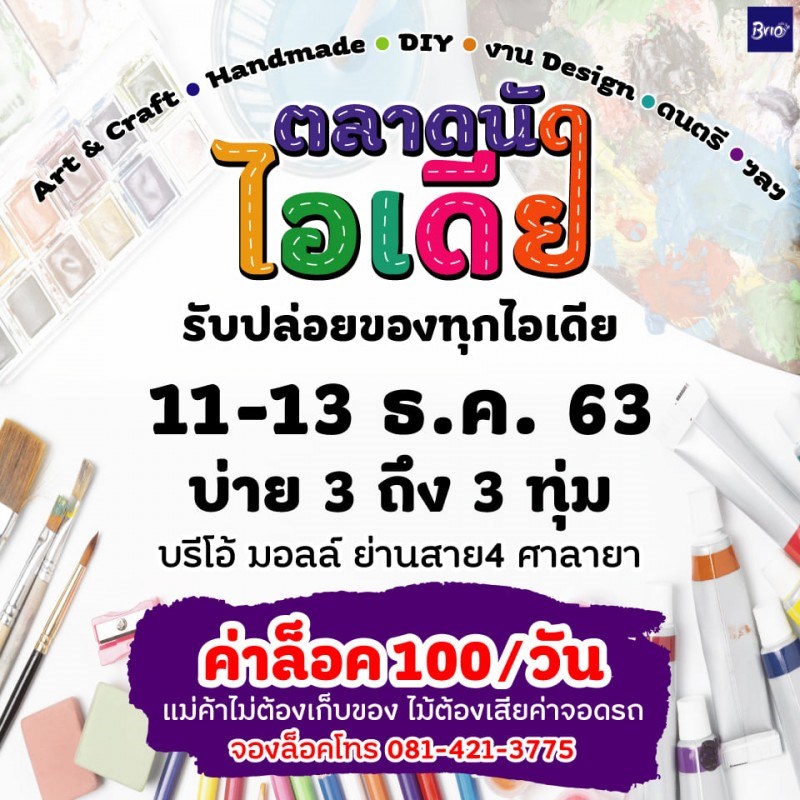 ตลาดนัดไอเดีย วันที่ 11 - 13 ธันวาคม 2563 เวลา 15.00 - 21.00 น. ณ ลานกิจกรรมกลาง บรีโอ้สาย4 เปิดจองล๊อค...ตลาดนัดไอเดีย รับปล่อยของทุกไอเดีย [ Art&Craft, Handmade, DIY, งานDesign, ดนตรี ฯลฯ] 11 - 13 ธันวาคมนี้...บ่าย 3 - 3 ทุ่ม ณ ลานกิจกรรมกลาง บรีโอ้สาย4 ลานโล่ง โปร่ง สบาย เดินง่าย ไม่ร้อน พร้อมที่จอดรถกว่า 500 คัน และร้านค้าร้านอาหารมากมาย ให้งานทำมือ เป็นของขวัญพิเศษ สำหรับคนพิเศษ