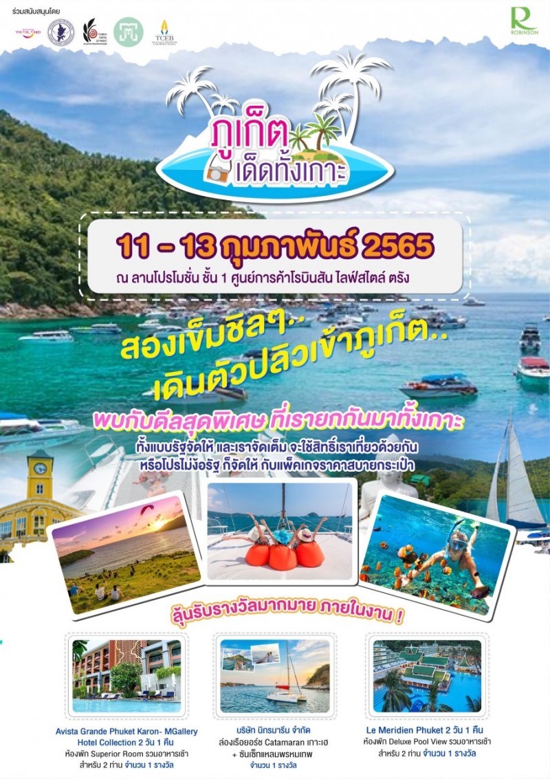 ภูเก็ตเด็ดทั้งเกาะ วันที่ 11 - 13 กุมภาพันธ์ 2565 ณ โรบินสัน ไลฟ์สไตล์ ตรัง สายเที่ยวห้ามพลาด! โปรโมชั่นห้องพักและแพคเกจทัวร์สุดปัง สมาคมธุรกิจการท่องเที่ยวจังหวัดภูเก็ต ร่วมกับสภาอุตสาหกรรมท่องเที่ยวจังหวัดภูเก็ตโดยการสนับสนุนจากการท่องเที่ยวแห่งประเทศไทย ขนโปรท่องเที่ยวและที่พักภูเก็ตสุดคุ้มเอาใจสายเที่ยวกันถึงตรังและจังหวัดใกล้เคียง กับโปรเด็ดๆ ดีลปังๆ ที่เรายกกันมาทั้งเกาะ ทั้งแบบรัฐจัดให้และเราจัดเต็มใช้สิทธิ์เราเที่ยวด้วยกัน หรือโปรไม่ง้อรัฐ เราก็จัดให้ แพคเกจฟินๆ ราคาสบายกระเป๋า คุ้มกว่านี้ไม่มีอีกแล้ว พบกันที่งานภูเก็ตเด็ดทั้งเกาะเท่านั้น วันที่ 11 - 13 กุมภาพันธ์ 2565 ที่โรบินสัน ไลฟ์สไตล์ ตรัง ฉีดวัคซีนสองเข็มชิลๆ เดินตัวปลิวเข้าภูเก็ต มีทั้งแพคเกจทัวร์สุดปัง ปาร์ตี้เรือยอร์ชสุดหรู พร้อมแอดเวนเจอร์ไปกับ Zipline และโรงแรมชิคๆให้เลือกหลากหลาย พลาดไม่ได้! และ ทุกยอดการจอง 1,000 บาท ลุ้นรับรางวัลอีกมากมาย
