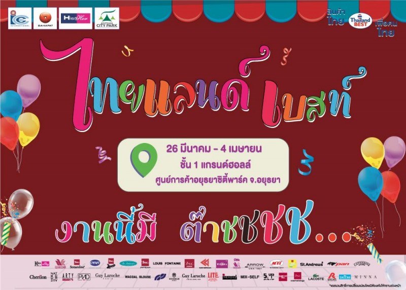 ไทยแลนด์ เบสท์ วันที่ 26 มีนาคม - 4 เมษายน 2565 ณ ศูนย์การค้าอยุธยาซิตี้พาร์ค "ไทยแลนด์ เบสท์" สินค้าไทยเพื่อคนไทย สุดคุ้มเกินราคาพบกับสินค้าในเครือ ICC อาทิ BSC / ARTY / Guy laroche / Lacoste / Arrow / Wacoal / ELLE / HOW / PAN / Naturalizer พบสินค้าแบรนด์ชั้นนำ ของรางวัลกิจกรรม และโปรโมชั่นอีกมากมาย วันที่ 26 มี.ค. - 4 เม.ย. 65 ณ ชั้น 1 แกรนด์ฮอลล์ อยุธยาซิตี้พาร์ค จัดโดย บริษัท ไอ.ซี.ซี. อินเตอร์เนชั่นแนล จำกัด (มหาชน)