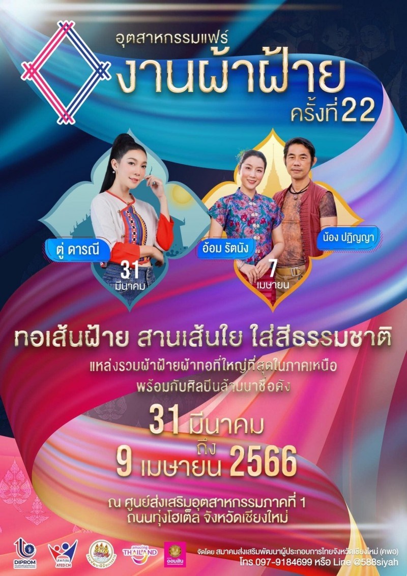 เชิญเที่ยวงานผ้าฝ้าย ครั้งที่ 22 "ทอเส้นฝ้าย สานเส้นใย ใส่สีธรรมชาติ" ยกขบวนสินค้า แหล่งรวมผ้าฝ้าย ผ้าทอที่ใหญ่ที่สุดของภาคเหนือและสินค้ามากมายกว่า 400 ร้านค้าอาทิ เครื่องประดับ งานแฮนด์เมด เครื่องหนัง กิจกรรมเวิร์คช็อปจากผู้เชี่ยวชาญ อาหารสุดอร่อย และ พบกับความบันเทิง ณ ศูนย์ส่งเสริมอุตสาหกรรมภาคที่ 1 ถนนทุ่งโฮเต็ล เชียงใหม่ วันศุกร์ที่ 31 มีนาคม - วันอาทิตย์ ที่ 9 เมษายน 2566