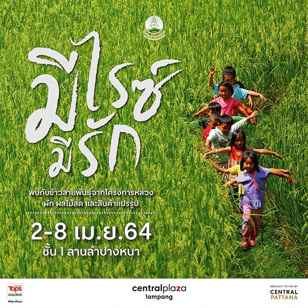 มีไรซ์ มีรัก วันที่ 2 - 8 เมษายน 2564 ณ ลานลำปางหนา ชั้น 1 เซ็นทรัลพลาซา ลำปาง มี Rice มีรัก มหัศจรรย์พืชพันธุ์โครงการหลวงจากยอดดอยสู่เมือง เลือกซื้อ"ข้าวสายพันธุ์โครงการหลวง" ข้าวกล้องเฮงาะเลอทิญ, ข้าวกล้องเหลือง, ข้าวกล้องไก่ป่าข้าวดอยซ้อมมือในราคาสุดพิเศษ พร้อมความสดส่งตรงจากดอยผัก ผลไม้ และ สินค้าดอยคำ
