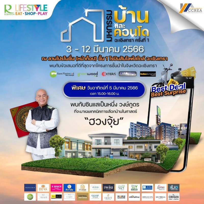 Best Deal Best Surprise! พบกับข้อเสนอ ที่ดีที่สุดจากโครงการชั้นนำในฉะเชิงเทรากว่า 30 โครงการ พร้อมลุ้นรับรางวัลมากมายเมื่อแวะเยี่ยมชมและจองบ้านและคอนโดภายในงาน อาทิเช่น