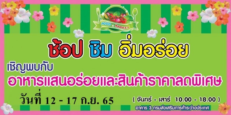ช้อป ชิม อิ่มอร่อย วันที่ 12 - 17 กันยายน 2565 ณ ศูนย์อาหาร กรมส่งเสริมการค้าระหว่างประเทศ พบกับสินค้าคุณภาพส่งออกหลายรายการ อาทิเช่น อาหารเลิศรส ขนมของฝาก สินค้า OTOP เสื้อผ้า เครื่องประดับจิวเวลรี่ สินค้าเพื่อสุขภาพและความงาน ของใช้ภายในบ้าน ฯลฯ และอื่น ๆ อีกมากมายภายในงาน ณ อาคาร 3 ศูนย์อาหาร กรมส่งเสริมการค้าระหว่างประเทศจันทร์-เสาร์ เวลา 10.00 - 18.00 น