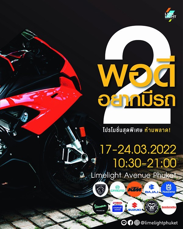 พอดีอยากมีรถ 2 ครั้งที่ 2 วันที่ 17 - 24 มีนาคม 2565 ณ ไลม์ไลท์ อเวนิว ภูเก็ต ไลม์ไลท์ อเวนิว ภูเก็ต จัดงาน "พอดีอยากมีรถ" ครั้งที่ 2 เพื่อให้คนที่มองหารถมอเตอร์ไซค์ มีทางเลือกพร้อมรับโปรโมชั่น และทดลองขับ ระหว่างวันที่ 17 - 24 มีนาคม 2565 ณ ลานโปรโมชั่น ชั้น 1 ไลม์ไลท์ อเวนิว ภูเก็ต พบกับรถ Suzuki / Lambretta / Peugeot / CFMOTO / KTM / HusQvana / Bajaj / Yamaha / Vespa เพียงแวะมาที่บูทก็รับคูปองลุ้นบัตรรับประทานอาหารจากร้านดัง ได้แก่ บัตรรับประทานชาบู ที่ Namaka Resort Kamala 1 รางวัล Gift voucher Sunday Brunch จาก The Vijitt Resort Phuket 1 รางวัล บัตรรับประทานอาหาร ที่ Twilight Sky by The SIS Kata มูลค่า 1,000 บาท 1 รางวัล Gift voucher Set โปรโมชั่น มื้อนี้อิ่มคุ้ม 200 บาท พร้อมของพรีเมี่ยมจาก Limelight 5 รางวัล วันพุธ พฤหัสบดี และศุกร์ รับคูปองเครื่องดื่มฟรี จากหลาดปล่อย
