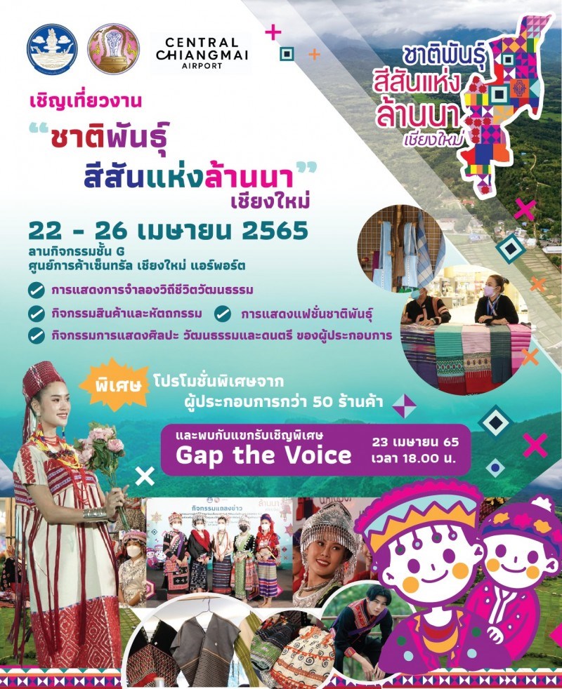 จังหวัดเชียงใหม่โดยสำนักงานท่องเที่ยวและกีฬาจังหวัดเชียงใหม่ ยกขบวนชุมชนท่องเที่ยวและกลุ่มชาติพันธุ์จังหวัดเชียงใหม่ มาให้ได้ชมกันในงาน "ชาติพันธุ์ สีสันแห่งล้านนาเชียงใหม่ ครั้งที่ 2" วันที่ 22 - 26 เมษายน 2565 ณ ลานกิจกรรมชั้น G เซ็นทรัล เชียงใหม่ แอร์พอร์ต