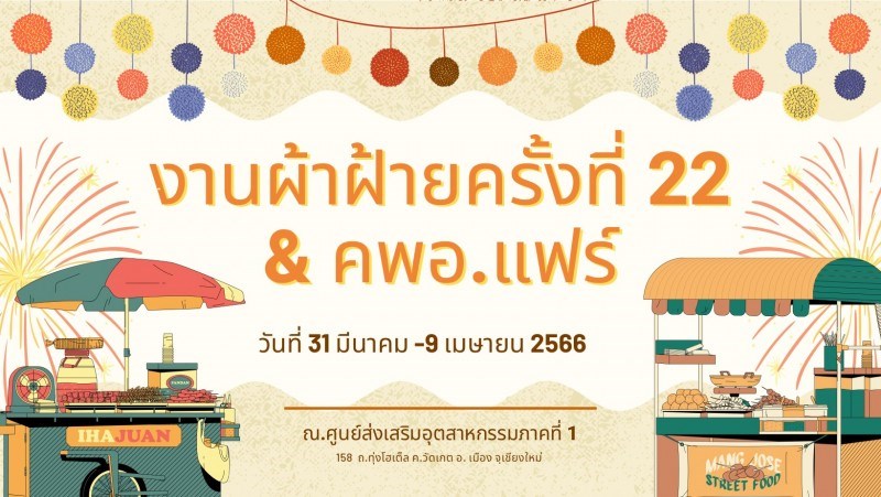 งานผ้าฝ้ายครั้งที่ 22 และ คพอ.แฟร์ ประจำปี 2566 จัดโดย สมาคม ATED.CM สมาคมส่งเสริมพัฒนาผู้ประกอบการไทย จ.เชียงใหม่ แหล่งรวมผ้าฝ้าย ผ้าทอ ที่ใหญ่ที่สุดในภาคเหนือ และสินค้ามากมาย อาทิเช่น ผลิตภัณฑ์จากผ้าฝ้าย เครื่องประดับ งานแฮนด์เมค อาหารสุดอร่อย และกิจกรรม WorkShop จากผู้เชี่ยวชาญมากมาย พร้อมกิจกรรมสุดเซอร์ไพรส์ในทุก ๆ วัน