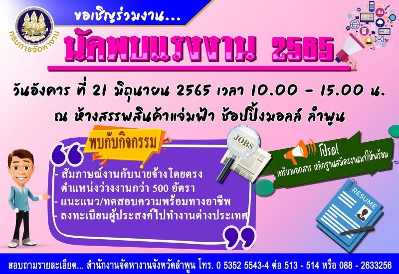 นัดพบแรงงาน 2565 วันที่ 21 มิถุนายน 2565 ณ ศูนย์การค้าแจ่มฟ้าช้อปปิ้งมอลล์ ลำพูน สำนักงานจัดหางานจังหวัดลำพูน ขอเชิญร่วมงาน "นัดพบแรงงาน ประจำปี 2565" วันอังคารที่ 21 มิถุนายน 2565 เวลา 10.00 - 15.00 น. ณ ลานโปรโมชั่น ชั้น 1 ศูนย์การค้าแจ่มฟ้าช้อปปิ้งมอลล์ ลำพูน ภายในงานพบกับการสัมภาษณ์งานกับนายจ้างโดยตรง, ตำแหน่งงานว่างกว่า 500 อัตรา, แนะแนว/ทดสอบความพร้อมทางอาชีพ, ลงทะเบียนผู้ประสงค์ไปทำงานต่างประเทศ อย่าลืมเตรียมเอกสาร หลักฐานการสมัครมาให้พร้อม