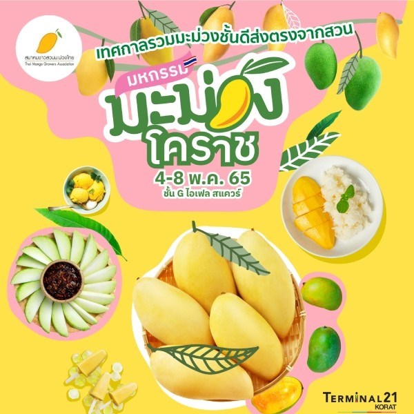 ศูนย์การค้าเทอร์มินอล21 โคราช ร่วมกับ สมาคมชาวสวนมะม่วงไทยจัดงานมหกรรมมะม่วงโคราช คัดสรรมะม่วงไทย เกรดส่งออก จาก อำเภอปากช่องและวังน้ำเขียว และพร้อมโปรโมชั่นสุดคุ้ม ช้อปมะม่วงน้ำดอกไม้ส่งออก กล่อง 99 บาท จากปกติ 250 บาท เฉพาะสมาชิก T21 Reward ใช้แค่ 1 พอยต์ + 99 บาทอิ่มสุดคุ้ม บุฟเฟ่ต์เมนูมะม่วง 21 บาท เช็คอิน&แชร์ แลกซื้อ มะม่วงกิโลละ 1 บาท คละสายพันธุ์ *จำกัดวันละ 100 สิทธิ์ต่อวัน