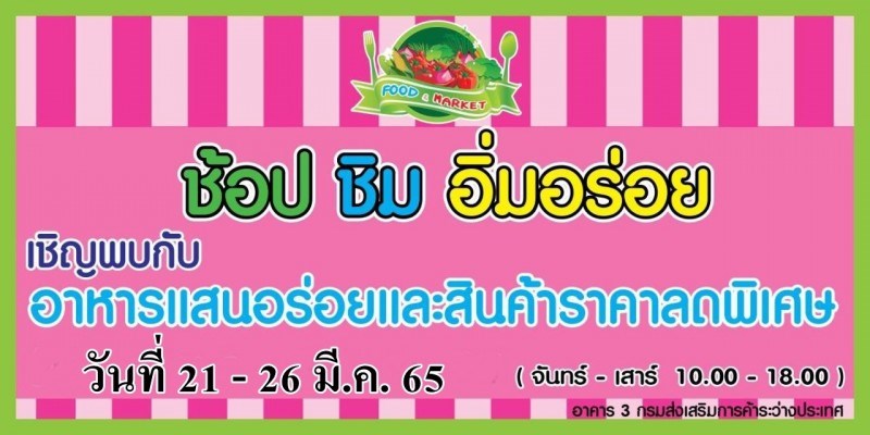 ช้อป ชิม อิ่มอร่อย วันที่ 21 - 26 มีนาคม 2565 ณ อาคาร 3 ศูนย์อาหาร กรมส่งเสริมการค้าระหว่างประเทศ พบกับสินค้าคุณภาพส่งออกหลายรายการ อาทิเช่น อาหารเลิศรส ขนมของฝาก สินค้า OTOP เสื้อผ้า เครื่องประดับจิวเวลรี่ สินค้าเพื่อสุขภาพและความงาม ของใช้ภายในบ้าน ฯลฯ และอื่น ๆ อีกมากมายภายในงาน วันจันทร์ - เสาร์ เวลา 10.00 - 18.00 น.