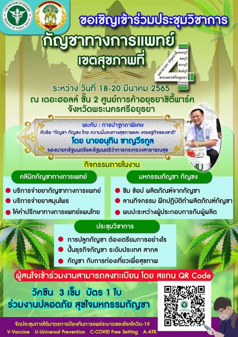 วันที่ 18 - 20 มีนาคม 2565 ณ ศูนย์การค้าอยุธยาซิตี้พาร์ค สำนักงานปลัดกระทรวงสาธารณสุขร่วมกับเขตสุขภาพที่ 4 โดยสำนักงานสาธารณสุขจังหวัดพระนครศรีอยุธยา ได้จัดการประชุมวิชาการกัญชาทางการแพทย์เขตสุขภาพที่ 4 ในระหว่างวันที่ 18 - 20 มีนาคม 2565 ณ ศูนย์การค้าอยุธยาซิตี้พาร์ค จังหวัดพระนครศรีอยุธยา เพื่อเสริมสร้างความรู้ความเข้าใจแลกเปลี่ยนประสบการณ์ และข้อมูลวิชาการกัญชาทางการแพทย์ ส่งเสริมกัญชากัญชงเพื่อเศรษฐกิจ และการเข้าถึงบริการคลินิกกัญชาทางการแพทย์ของประชาชน ซึ่งกลุ่มเป้าหมายในการจัดงาน ได้แก่ ผู้ประกอบวิชาชีพแผนปัจจุบัน แผนไทย ประชาชนและผู้ประกอบการ ขอเรียนเชิญผู้สนใจ เข้าร่วมรับฟังการบรรยาย และพบกับกิจกรรมที่น่าสนใจเกี่ยวกับการใช้กัญชาทางการแพทย์ ชมนิทรรศการ พร้อมเข้าปรึกษาแพทย์เฉพาะทาง ที่คลินิกกัญชาทางการแพทย์