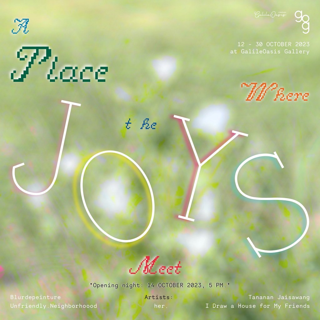 นิทรรศการ “A place where the joys meet” ได้รวบรวมเรื่องราวเล็กๆน้อยๆแต่เต็มไปด้วยความสุขใจที่อาจถูกมองผ่านไป ผ่านผลงานของศิลปินทั้ง 5 คน ที่จะมาร่วมแชร์มุมมองความสุขผ่านสายตาการมองโลกที่แตกต่างกัน พร้อมกับอยากให้ทุกคนมาเอนจอยโมเม้นเล็กๆกัน เพราะคงจะไม่ใช่ทุกคนที่สามารถตอบคำถามได้ทันทีว่า ความสุขของตัวเองล่ะ คืออะไร? แต่จะรู้ว่าจริงๆแล้วความสุขอยู่รอบตัวเราและสามารถมองหามันได้ตลอดเวลาเลยนะ!