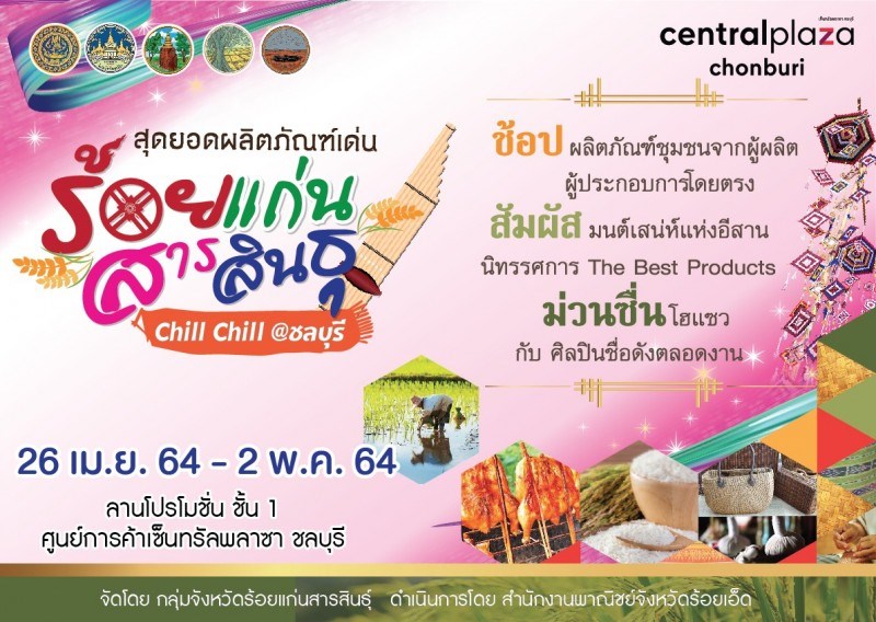 ร้อยแก่นสารสินธุ วันที่ 26 เมษายน-2 พฤษภาคม 2564 ลานกิจกรรม ชั้น 1 ศูนย์การค้าเซ็นทรัลพลาซา ชลบุรี จังหวัดร้อยเอ็ดร่วมกับสำนักงานพาณิชย์จังหวัดร้อยเอ็ดและกลุ่มจังหวัดร้อยแก่นสารสินธุ์ นำสุดยอด ผลิตภัณฑ์เด่นจากจังหวัดร้อยเอ็ด ขอนแก่น มหาสารคามและกาฬสินธุ์ ซึ่งได้รับการคัดสรรสู่ภาคตะวันออก จังหวัดชลบุรี ภายในงานพบกับผลิตภัณฑ์นวัตกรรม ชิม เลือกซื้อข้าวหอมมะลิทุ่งกุลาร้องไห้ ช้อปผ้าไหม ผ้าฝ้าย ของใช้ ของตกแต่ง สมุนไพรแปรรูป มุมอาหารอีสานรสแซ่บ สัมผัสมนต์เสน่ห์แห่งอีสาน 'นิทรรศการ The Best Products' พูดคุย เจรจาธุรกิจกับผู้ประกอบการโดยตรง