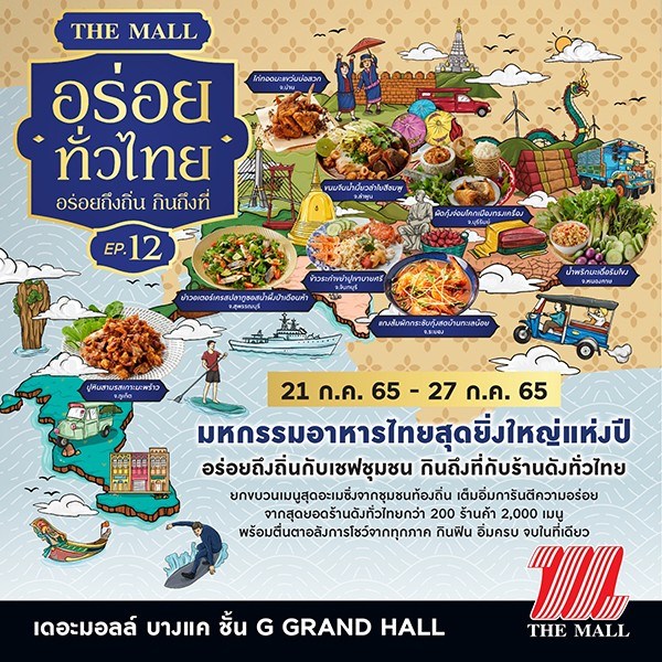 อร่อยทั่วไทย EP.12 "อร่อยถึงถิ่น กินถึงที่" มหกรรมอาหารไทยสุดยิ่งใหญ่แห่งปี​ ยกขบวนเมนูสุดอะเมซิ่งจากชุมชนท้องถิ่น เต็มอิ่มการันตีความอร่อย จากสุดยอดร้านดังทั่วไทยกว่า 200 ร้านค้า 2,000 เมนู พร้อมตื่นตาอลังการโชว์จากทุกภาค​ และโปรโมชั่นสุดพิเศษเฉพาะงานนี้เท่านั้น กินฟิน อิ่มครบ ที่เดอะมอลล์ ที่เดียว​ วันที่ 21 ก.ค. 65​​ - 27 ก.ค. 65 ณ บริเวณ GRAND HALL ชั้น G เดอะมอลล์ บางแค
