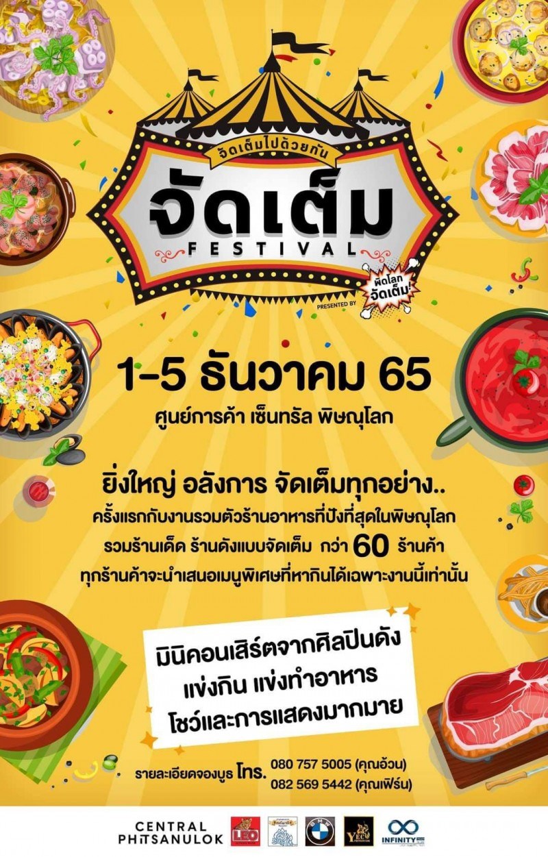 จัดเต็มเฟสติวัล งานไม่ใหญ่แน่ ครั้งแรกของชาวพิษณุโลกจัดเต็ม ที่จะมีงานมหกรรม กิน ดื่ม เที่ยว ในงานเดียวกัน รวมร้านอร่อย เด็ด ปัง ในคอนเซปต์ "จัดเต็ม" ทั้งอาหาร คนขาย คนกิน พบกับเมนูพิเศษที่มีเฉพาะในงานนี้เท่านั้น กิจกรรมแข่งกิน แข่งทำอาหาร การแสดงพิเศษ โชว์พิเศษมากมาย มินิคอนเสิร์ตจากศิลปินดัง มาจัดเต็มไปด้วยกัน วันที่ 1 - 5 ธ.ค. 65 ณ ลานหน้าเซ็นทรัล พิษณุโลก