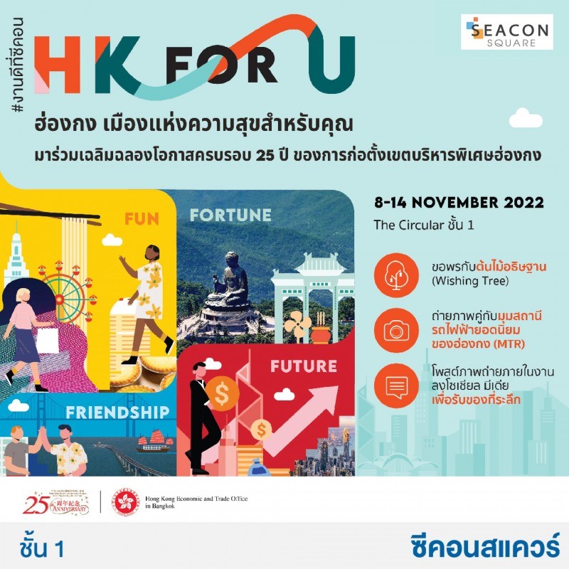 รับของที่ระลึกสุดพิเศษ ในงาน "ฮ่องกงเมืองแห่งความสุขสำหรับคุณ" (HK FOR U) วันที่ 8 - 14 พ.ย. 65 Circular ชั้น 1 (โซนโลตัส) ซีคอนสแควร์